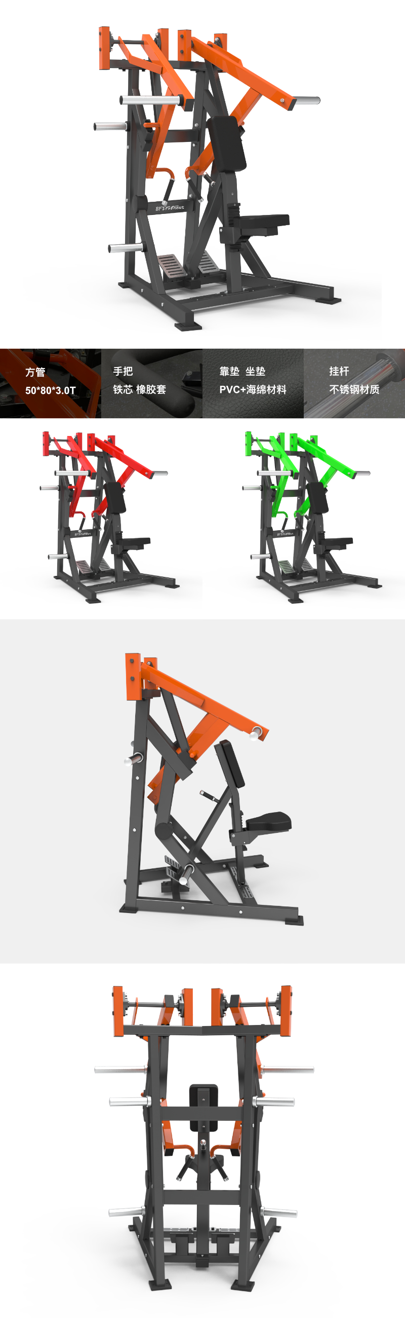BFT-E07 BFT-E07 坐式拉背训练器 尺寸:1430×1280×1700mm 净重: 152kgs 主管:方管50*80*3.0T 手把:φ25 铁芯+TPV橡胶套 靠垫/坐垫:PVC+海绵材料 挂杆:不锈钢材质 最大承重:300kg 获取报价
